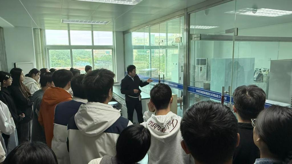 本次开放参观的实验室涵盖等离子体烧结、原子层沉积、静电纺丝、光伏发电、电池综合测试等多个前沿方向。在参观过程中,李方涛为同学们详细介绍了各种实验仪器的运行原理及操作方法。他结合各实验室特色,系统介绍了物理学在材料科学、新能源等前沿领域的研究方向。通过现场演示和互动讲解,同学们不仅了解到各类仪器的基本操作,更对科研工作的实际开展有了直观认识。