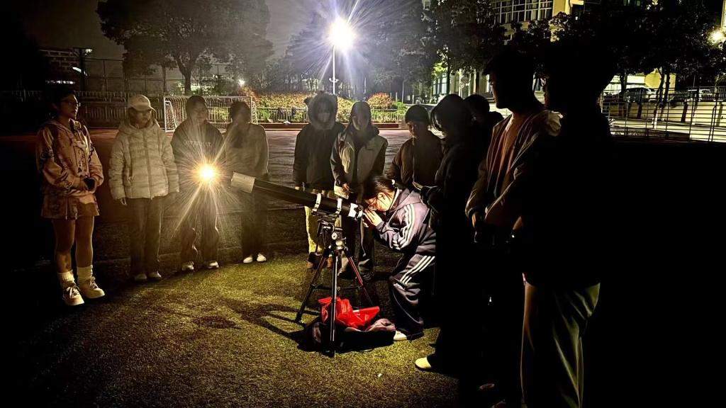 活动伊始,负责人王诗雨围绕月球基础知识、太阳系天体概况及基础观测技巧展开科普讲解。她用通俗易懂的语言,结合便携观测设备,向同学们介绍了月球表面的环形山特征,并详细演示了天文望远镜的调试与观测流程,耐心解答在场同学提出的各类天文疑问,帮助同学们初步掌握天文观测相关知识。在分组实操环节,同学们在志愿者的引导下动手调试设备、调节焦距,近距离观测月亮,清晰观测到月球明暗交界线与表面凹凸的纹理轮廓。大家边看边交流心得,相互讨论天文知识,在亲手探索中感受宇宙的静谧与浪漫。现场互动氛围浓厚,学习热情高涨。