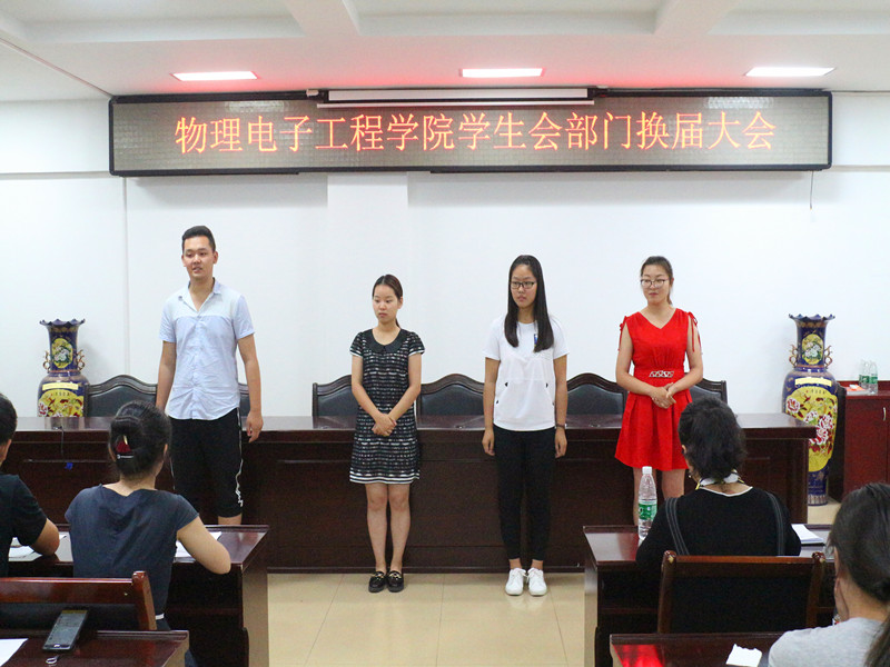6月4日下午,物电黄色网站 学生会部门换届大会于理科楼511会议室顺利进行,黄色网站 党委秘书张康华,团委老师杨勇、黄钰莹等领导老师莅临现场,与学生会主席团成员及各部门部长、副部长一同参加会议并担任评委。